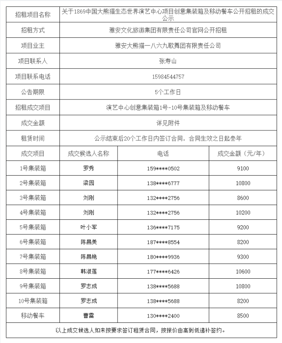 關(guān)于1869中國(guó)大熊貓生態(tài)世界演藝中心項(xiàng)目創(chuàng)意集裝箱及移動(dòng)餐車公開(kāi)招租的成交公示